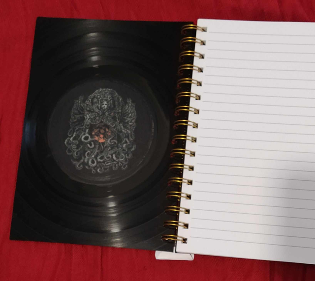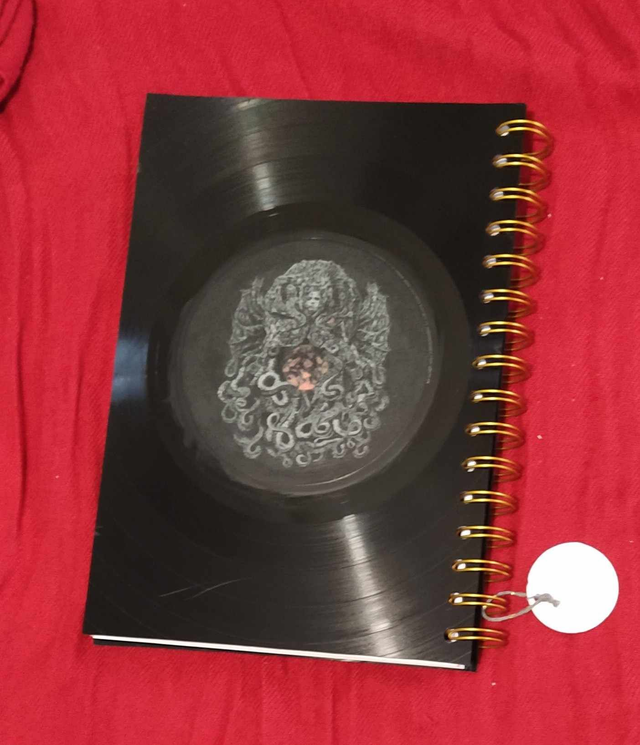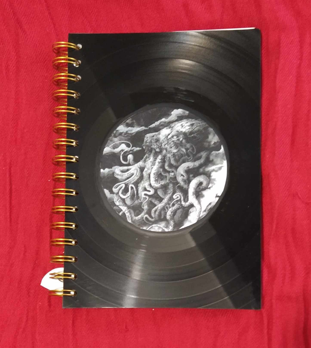 Un cahier d'environ 18 x 21 cm pour écrire au gré de vos inspirations. Il a été coupé et poncé à la main dans des disques vinyles rayés ou voilés pour leur donner un second souffle donc il y a des imperfections dues au vécu du disque. Les motifs est collé et vernis. Pour le nettoyage, pas de solvant, juste un coup de chiffon légèrement humidifié.