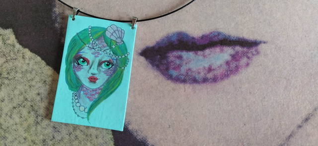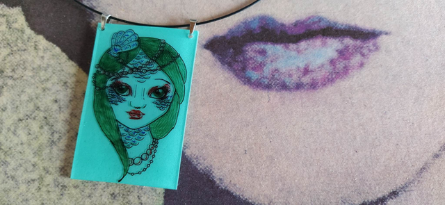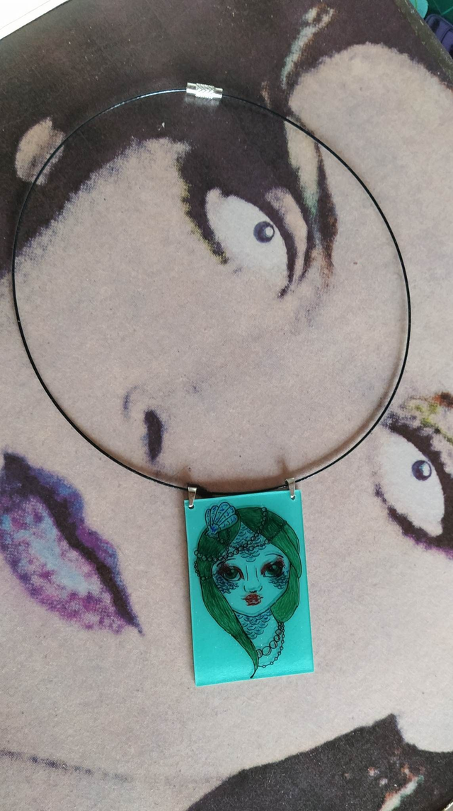 Pendentif en plastique fou de couleur monté sur un tour de cou fil câblé rigide noir avec fermoir à visser (Fermoir: 12 x 4 mm-Diamètre du fil câblé: 1 mm-Longueur: 45 cm). Dessin faits d'un coté aux crayons de couleur et de l'autre aux feutres d'où la possibilité de le porter d'un côté ou de l'autre. Création unique et originale