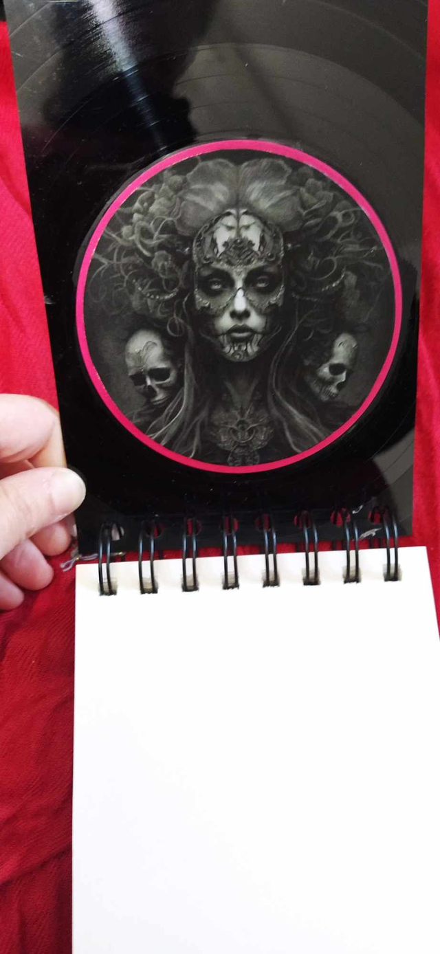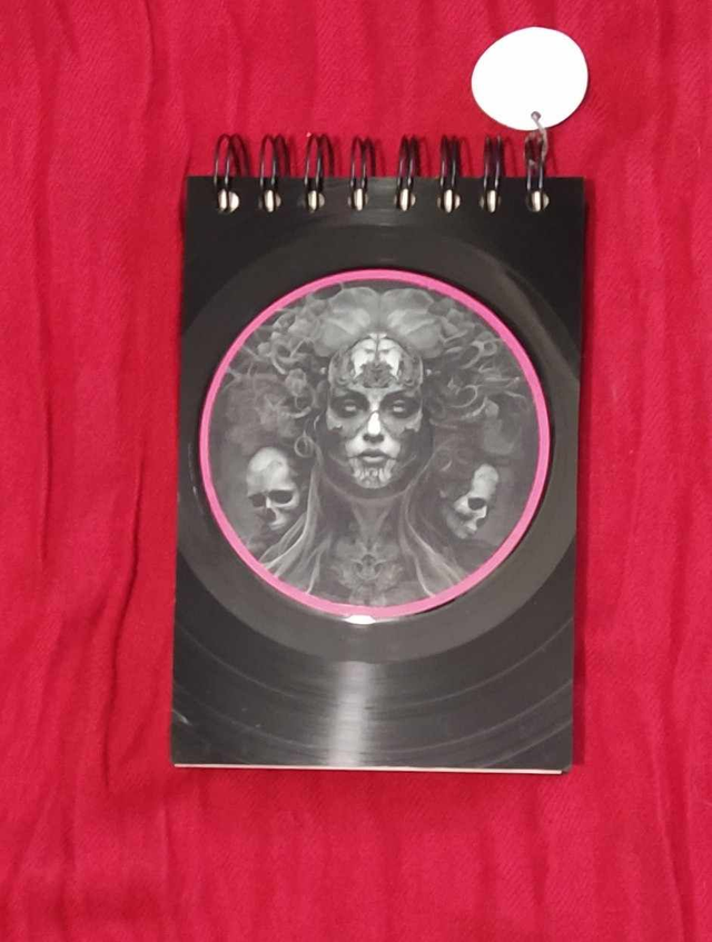 Un cahier d'environ 110 x 165 mm pour dessiner au gré de vos inspirations. Il a été coupé et poncé à la main dans des disques vinyles rayés ou voilés pour leur donner un second souffle donc il y a des imperfections dues au vécu du disque. Les motifs est collé et vernis. Pour le nettoyage, pas de solvant, juste un coup de chiffon légèrement humidifié.