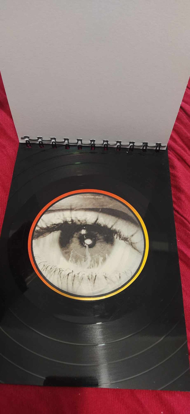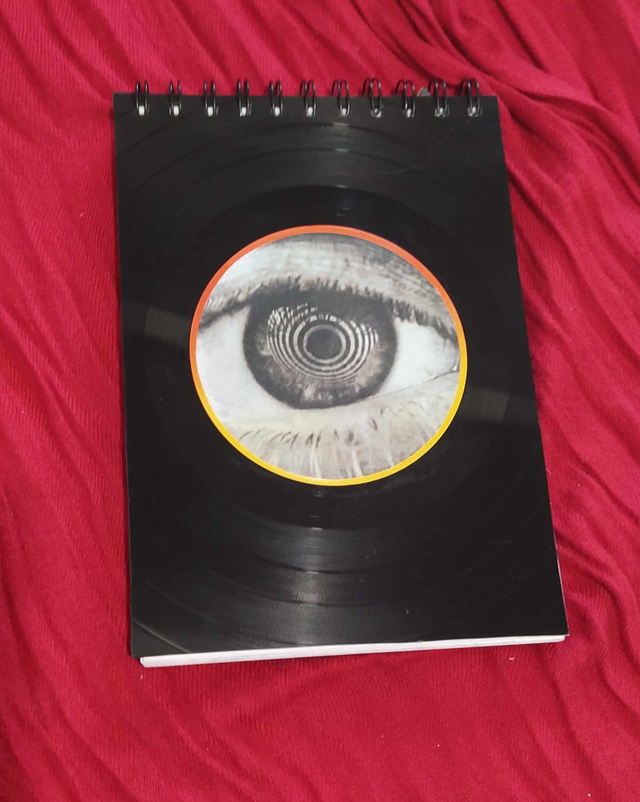Un cahier d'environ 145 x 225 mm pour dessiner au gré de vos inspirations. Il a été coupé et poncé à la main dans des disques vinyles rayés ou voilés pour leur donner un second souffle donc il y a des imperfections dues au vécu du disque. Les motifs est collé et vernis. Pour le nettoyage, pas de solvant, juste un coup de chiffon légèrement humidifié.